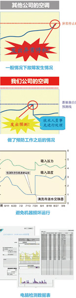 預(yù)防性工作一般包括 系統(tǒng)點檢就是將外機通過特有接口轉(zhuǎn)接到電腦上,在機器運行平穩(wěn)后通過專有軟件得到機器運行的所有參數(shù),將這些參數(shù)與正常運行值進行比較,找到其中的異常. 排查是根據(jù)點檢結(jié)果展現(xiàn)的異常趨勢判斷可能出現(xiàn)的問題,然后逐一排查確認.包括對系統(tǒng)的初始設(shè)計、工程安裝做重新審查. 修復(fù)包括機組的維修、系統(tǒng)大修和進行必要的改造,包括機組的使用建議等,以確保有系統(tǒng)能夠在長期平穩(wěn)運行.這就需要維保有單位不但要有清洗能力,還要具體維修、設(shè)計和安裝的能力. 大修是指是預(yù)防性定期維護保養(yǎng)服務(wù)之一.大修涉及對有異,F(xiàn)象的設(shè)備部分進行拆卸和檢修.檢測空調(diào)設(shè)備的損耗情況,并提供改進方案,并及時更換原廠配件. 對于較大的項目,通常工作步驟為:勘查現(xiàn)場,了解現(xiàn)狀->確定工作內(nèi)容->清洗、修復(fù)、點檢->交付維保報書