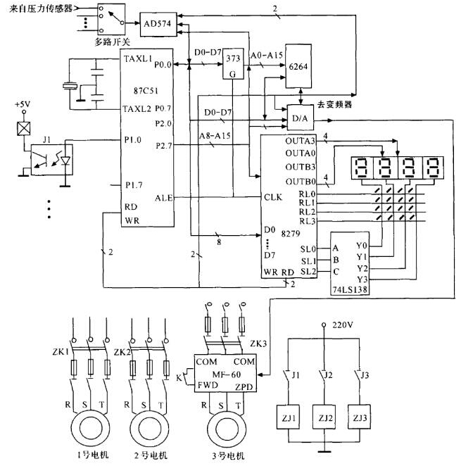 控制器主要實現(xiàn)對送風量的控制,使送風壓力保持基本恒定。這里用單片機及其外圍電路構(gòu)成,如圖4所示。用數(shù)碼管顯示送風壓力,壓力的給定可以用鍵盤輸入也可以用電位器經(jīng)A/ D轉(zhuǎn)換后輸入。控制器在功能上,既能實現(xiàn)連續(xù)控制,也能實現(xiàn)分級不連續(xù)控制,具體通過程序編制實現(xiàn)。